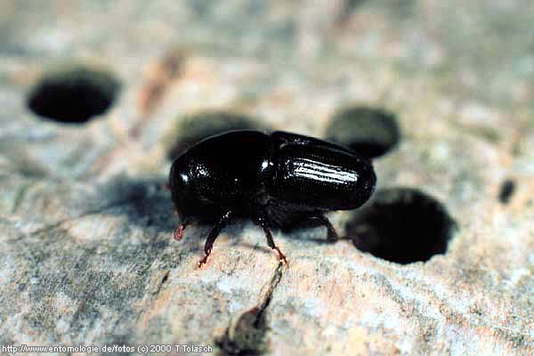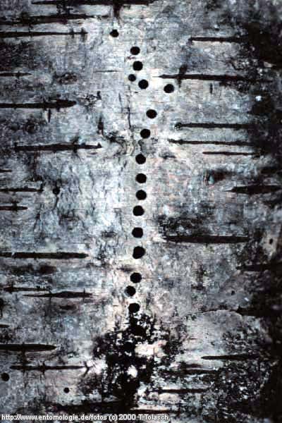 | Der Birkensplintkäfer ist die größte heimische Splintkäferart und die einzige, die sich in Birken entwickelt. Bruttaugliche absterbende Birken werden oft komplett vom Stamm bis in die Kronenäste besiedelt, wobei die Tiere unter der Rinde rund 10 cm lange "Muttergänge" anlegen, in denen Eier abgelegt werden und von wo aus die Larven später ihre Fraßgänge beginnen. Besonders auffällig sind die Ventliationslöcher, die von den Käfern in der Rinde über dem Muttergang angelegt werden. Diese haben Durchmesser von etwa 4 mm und stehen oft in ganz regelmäßigen Reihen (Abb. unten). Befallene Bäume mit Larven sind außerdem meist schon von weitem an den Spechteinhieben zu erkennen. Die Fotos stammen aus der Umgebung von Mölln / Schleswig - Holstein, wo Scolytus ratzeburgi stellenweise häufig vorkommt. |